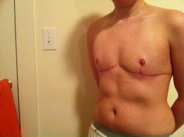 The incisions are still a mighty red, and there are tiny scabs leftover here and there. The hyper-sensation feeling – the unceasing discomforting tingling that was almost painful all over my chest – continued until late last week, and I firmly hope I’ve made it past that stage. Overall sensation is great; nothing is really numb, other than the area right on top the scars, and even there I feel general pressure. This is logical, since nerves were split at joined together at different endings, so it will obviously take time for that tissue to fully regenerate.