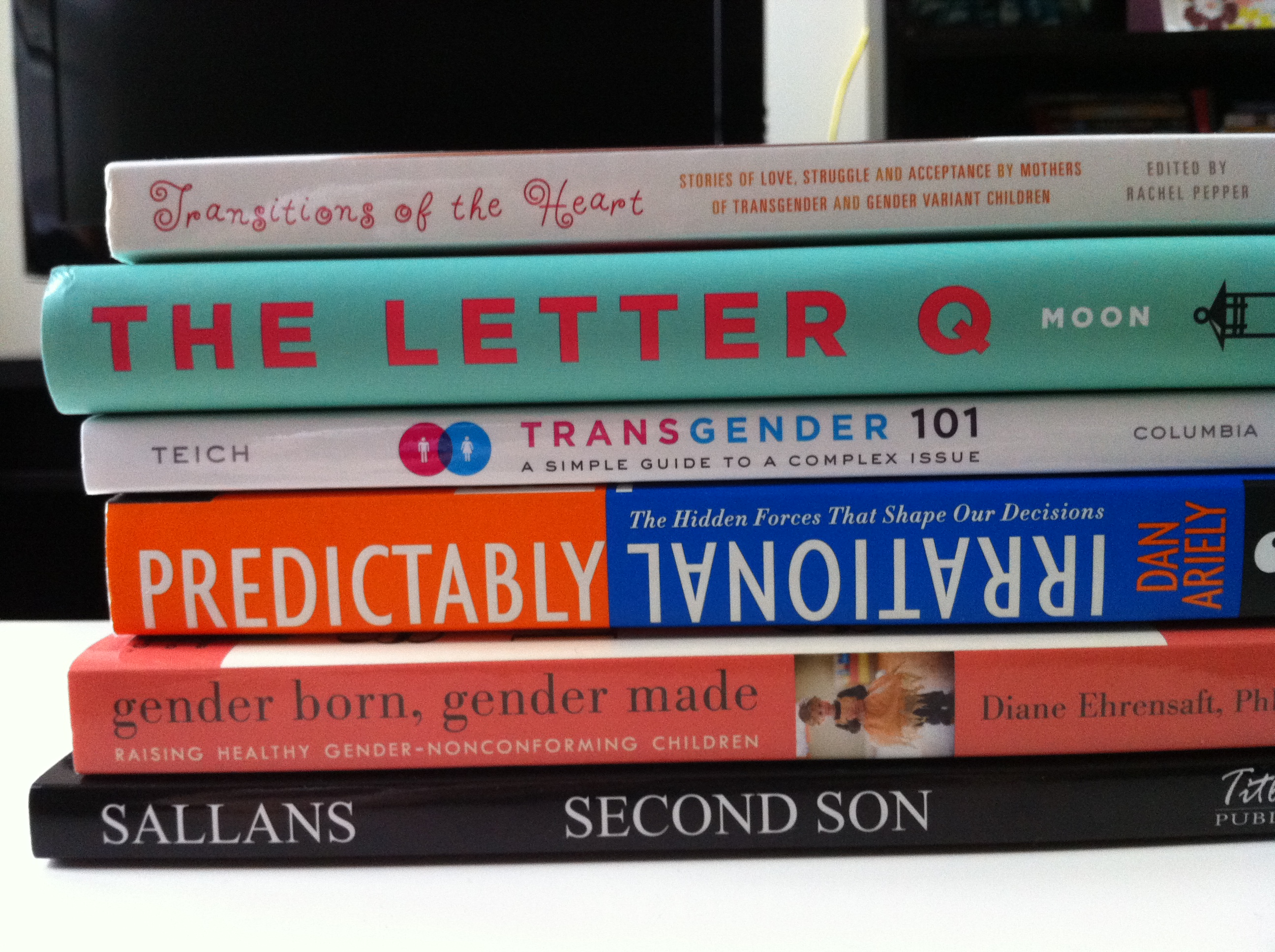 2. I just recently finished Transitions Of The Heart, and bought my son The Letter Q which he is enjoying a lot. He also really liked Chaz Bono’s book Transition. Most recently i’ve been reading books on eating disorders. Second Son is next on my list.
